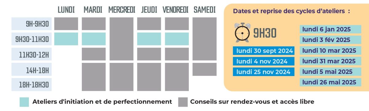 Le programme d’un « Cycle Atelier » est défini pour les 3 semaines suivantes. Les ateliers sont gratuits, sans obligation d’inscription ni de réservation.