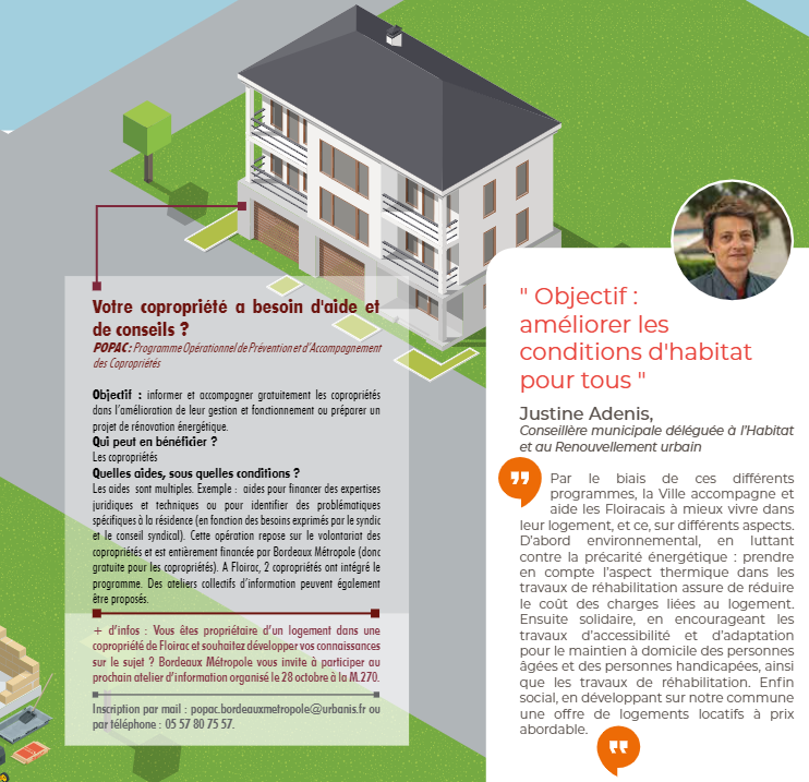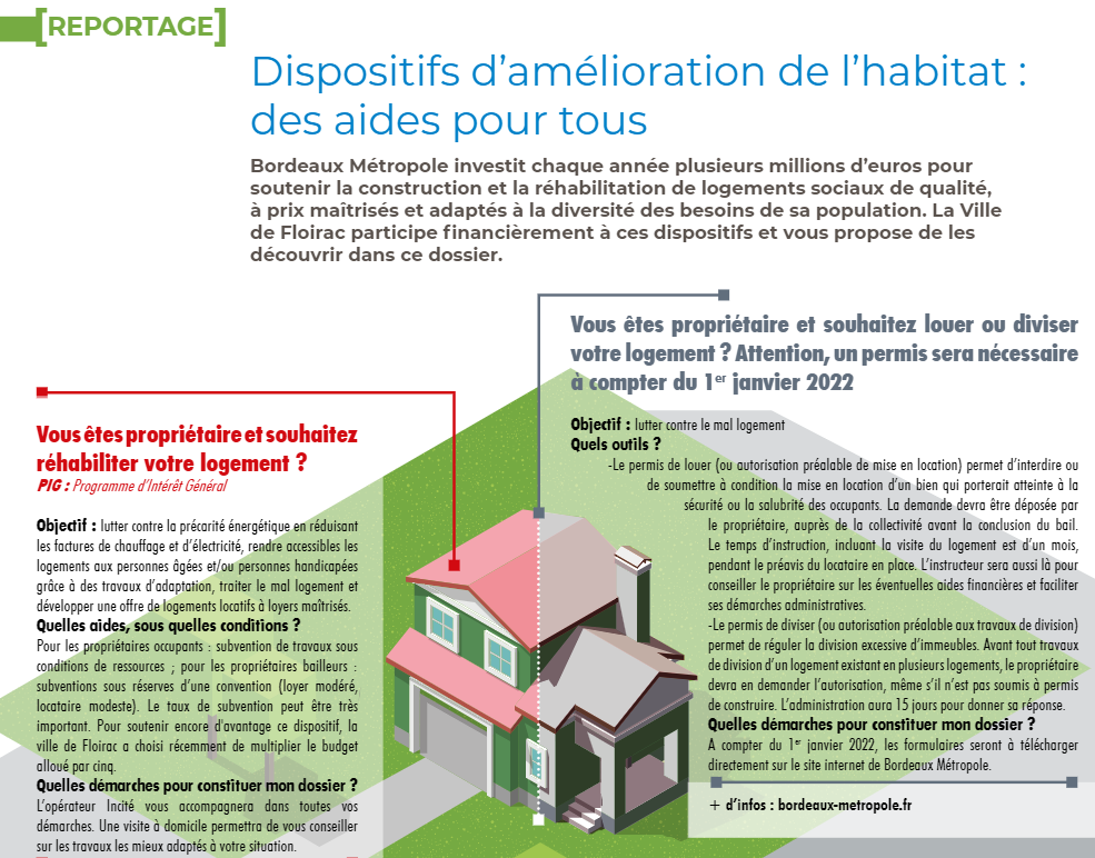 La Ville de Floirac est engagée aux côtés de Bordeaux Métropole dans le dispositif d’amélioration de l’habitat appelé « Programme d’Intérêt Général – Le réseau de la réhabilitation de Bordeaux Métropole ». À ce titre, la Ville participe au financement des réhabilitations de logements situés sur son territoire.